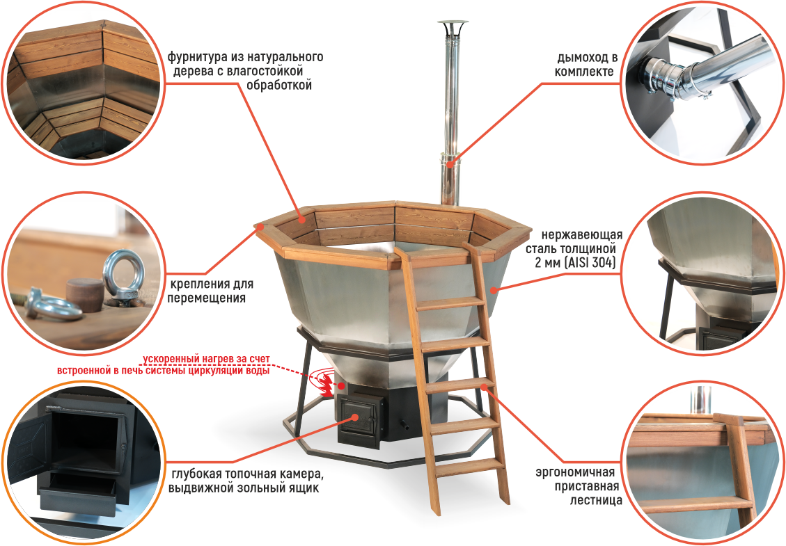 Мгновенное тепло и неповторимая атмосфера: благодаря высокой теплопроводности стали, а также печи, оснащенной системой циркуляции воды в самом чане, он быстро наполняется мягким, равномерным теплом. А живой огонь и треск настоящих дров создают особую ауру уюта и спокойствия — ощущение гармонии с природой. Топка дровами позволяет управлять температурой вручную, создавая идеальные условия для расслабления.