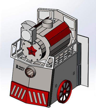 Комплектация: печь «Паровоз 18‑26 плазма» с выносным топливным каналом, паровозным свистком, «паровозной фарой», выдвижным зольником, колосниковой решёткой из чугуна, кожухом‑конвектором.